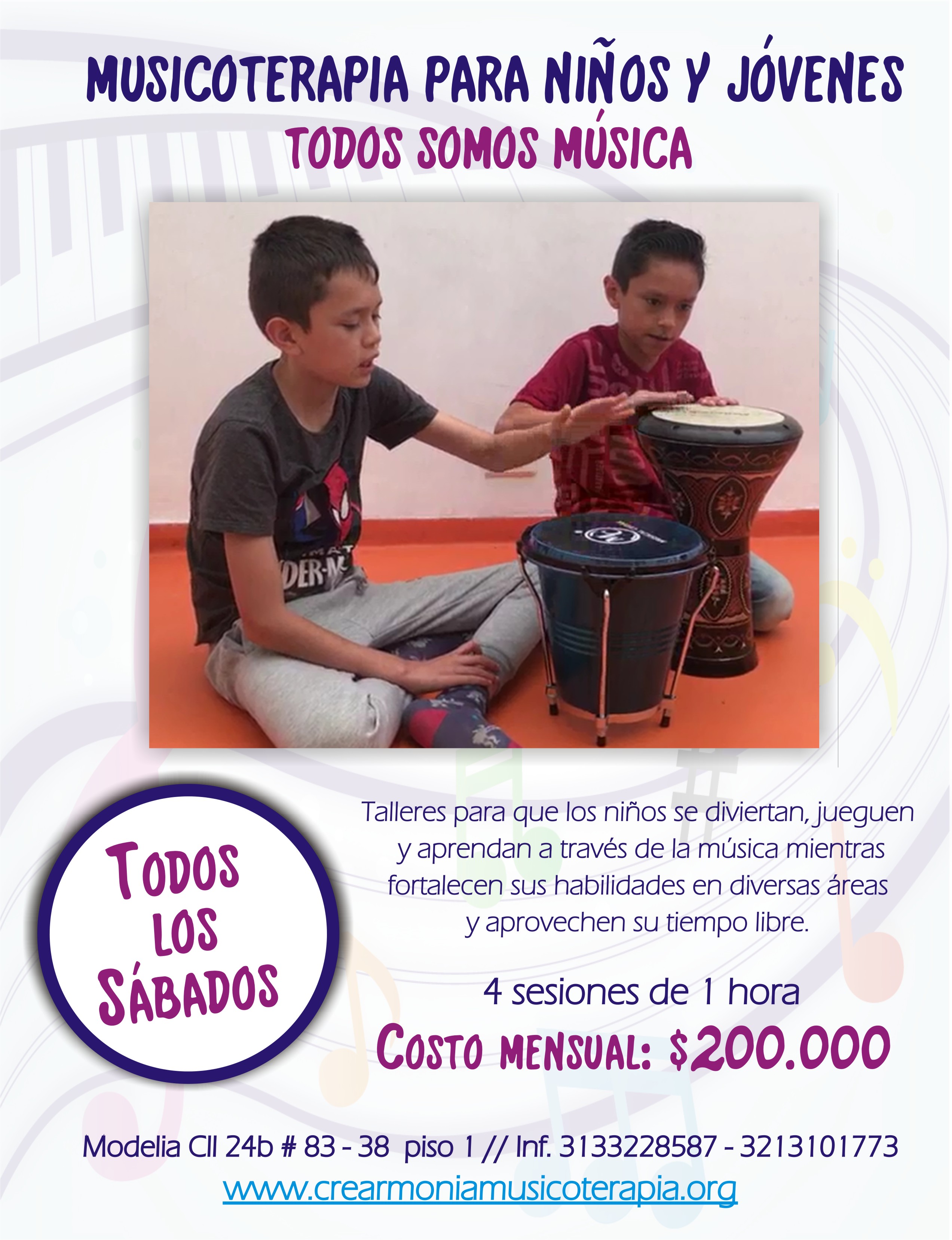 El programa de musicoterapia en estimulación creado para niños, promueve el desarrollo de capacidades cognitivas como la atención, percepción sensorial, motricidad, y adquisición del lenguaje. Simultáneamente fortalece habilidades relacionadas con la comunicación, expresión, creatividad, auto-confianza, entre otras. Utilizando la exploración de sonidos, el cuerpo y el movimiento, la interacción musical logra potenciar el aprendizaje de esta etapa.